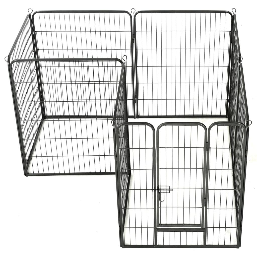 This dog kennel can be easily set up or taken down. It consists of 8 heavy-duty panels and each panel can be easily attached to the next, which allows you to configure the playpen in different shapes. The dog enclosure features a hinged door with security latches for easy access. This durable and weather-resistant dog playpen is made of rustproof powder-coated steel, making it suitable for outdoor and indoor use. The included ground stakes help secure the playpen outdoors for added stability and security.
