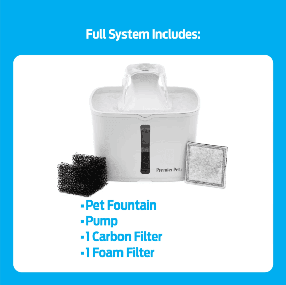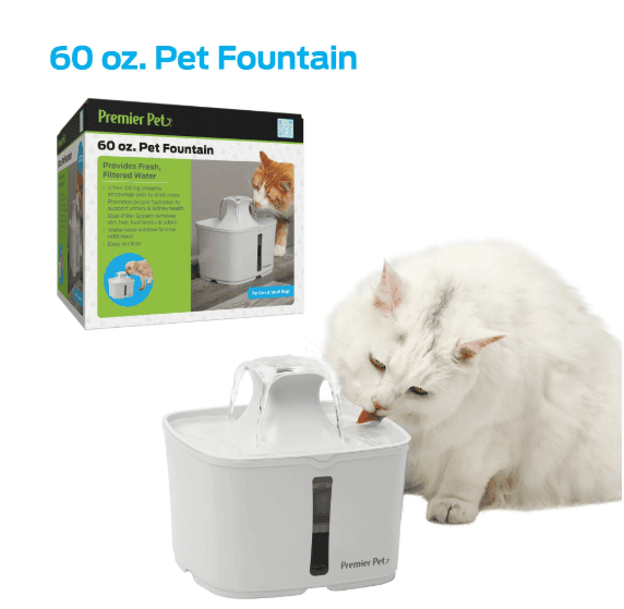 #1 PET FOUNTAIN IN THE US The Premier Pet® 60 oz. Fountain is a patented design pet fountain that provides your pet with 60 ounces of fresh, filter water. Flowing water encourages pets to drink more, therefore supporting urinary and kidney health through proper hydration, and a built-in dual-filter system includes an activated carbon filter to remove bad tastes and odors and a foam filter to remove dirt and hair. Constant flowing water, which can be adjusted with a flow control knob, helps to prevent bacteria growth, keeping the fountain cleaner than a standing water bowl. The new sleek, compact design offers your pet multiple drinking options: four free-flowing streams or the lower bowl with still water. The BPA-Free plastic design comes apart to make cleaning easy and is top-shelf dishwasher safe (excluding pump). Give yourself the happier, healthier pet you deserve by giving them the Premier Pet® 60 oz. Pet Fountain!