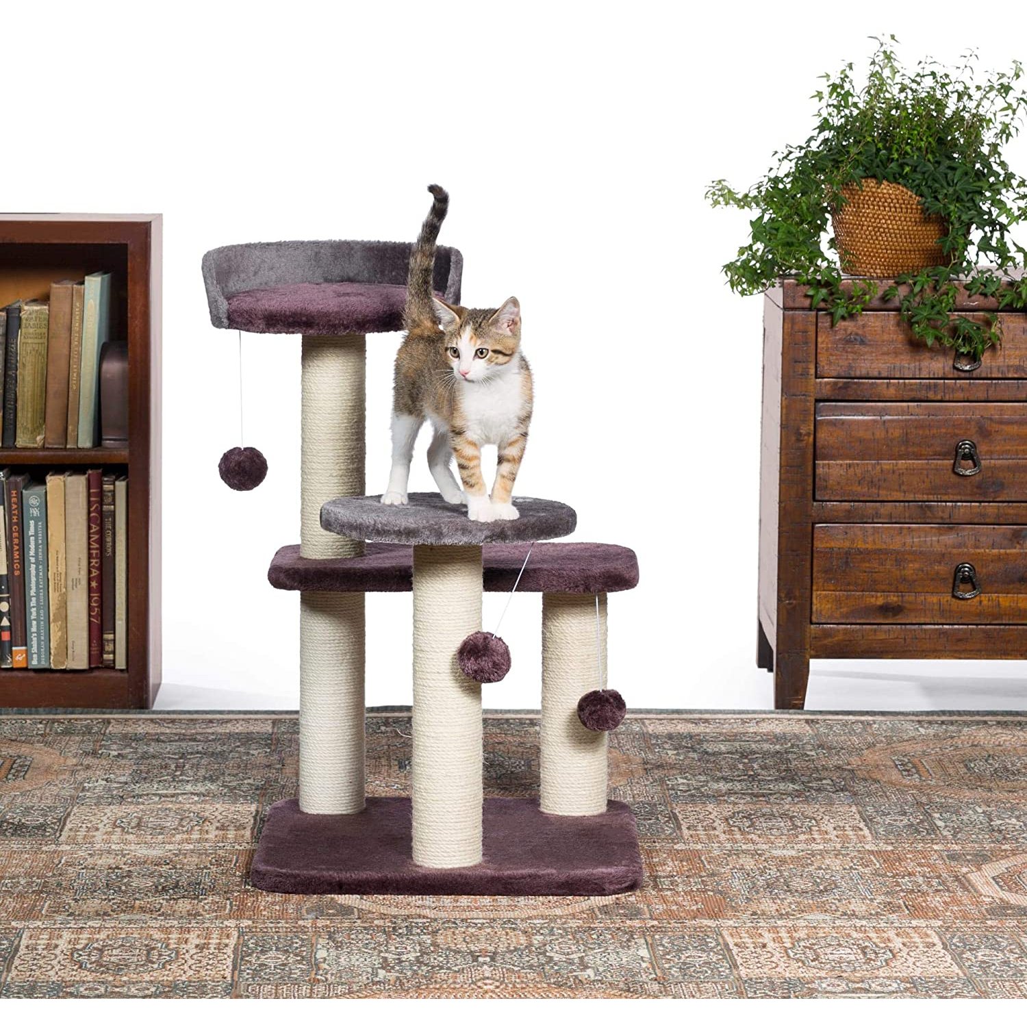 Prevue Pet Products Kitty Power Paws Play Palace 7301 combines super soft, plush fabrics with durable jute to provide the perfect place for lounging, sleeping, scratching and playing. In luxurious tones of Gray and Plum the Play Palace cat tree features a cushy day bed with a "U" shaped back, making your cat or kitten feel more secure and less vulnerable to sneak attacks. In addition to the cat bed, two additional platforms provide opportunities for pouncing and jumping plus enough vertical space for multiple cats to lounge comfortably. Three plush, dangling, swat toys hang playfully - one from the cat bed and one from each plush platform. Four individual, natural, jute rope scratching posts offer an appealing texture to cats, curbing inappropriate scratching behaviors and saving your sofa. Expertly designed cat furniture assembles easily and satisfies the needs of cats of all ages, sizes and activity levels. Measures 22" Long, 17 5/8" Wide and 28 3/8" High.
